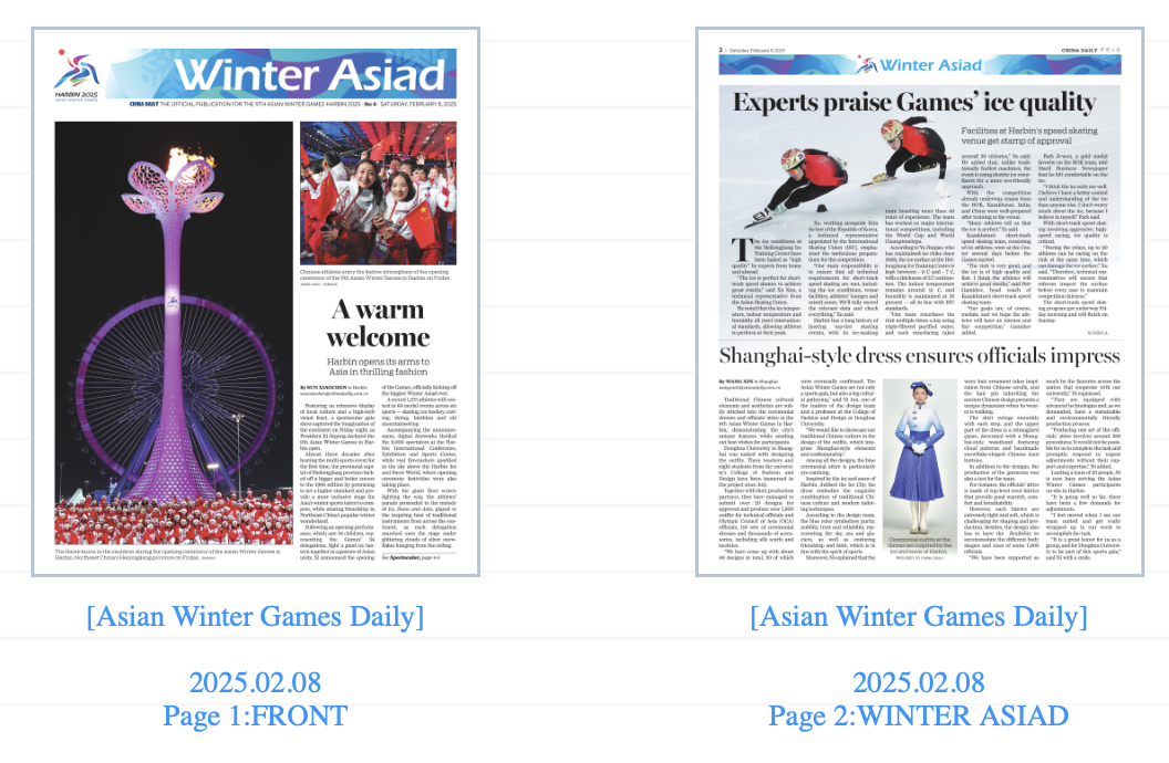 在接受中国日报China Daily记者采访时,本次服装设计团队负责人倪军教授说:“当我看到团队团结一致、全身心地投入到工作中去完成任务时,我很感动。能参与保障本届哈尔滨亚冬会,是我们这个集体的荣幸!”