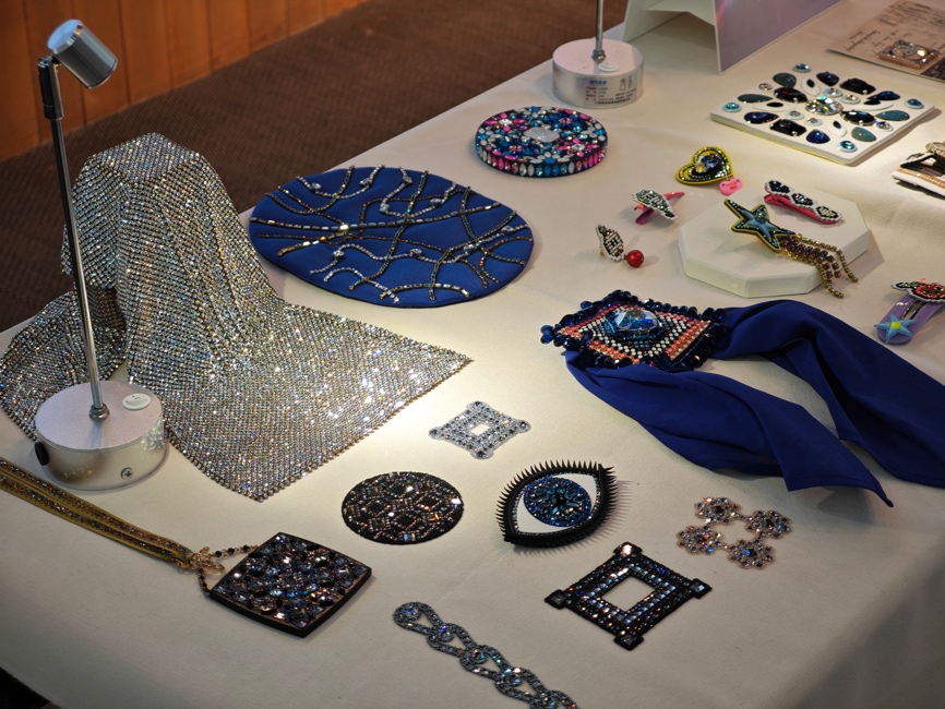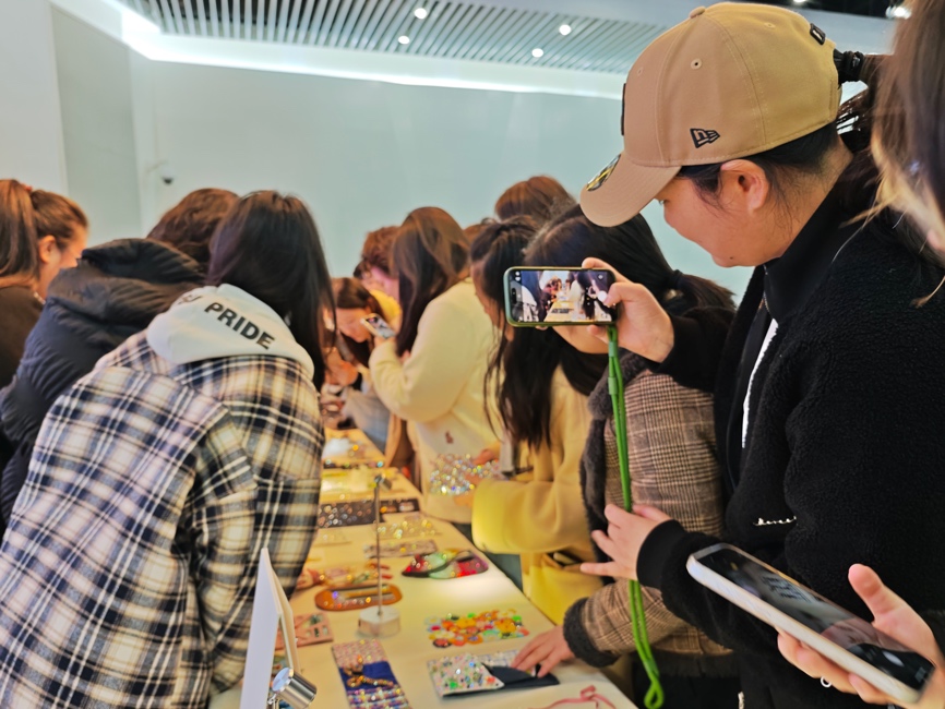 现场展示了上百款2026春夏系列仿水晶样品,涵盖不规则切割、渐变色彩、哑光质感等创新工艺。师生们近距离观察感受样品,探讨水晶元素在可持续时尚与功能性设计中的跨界应用可能。
